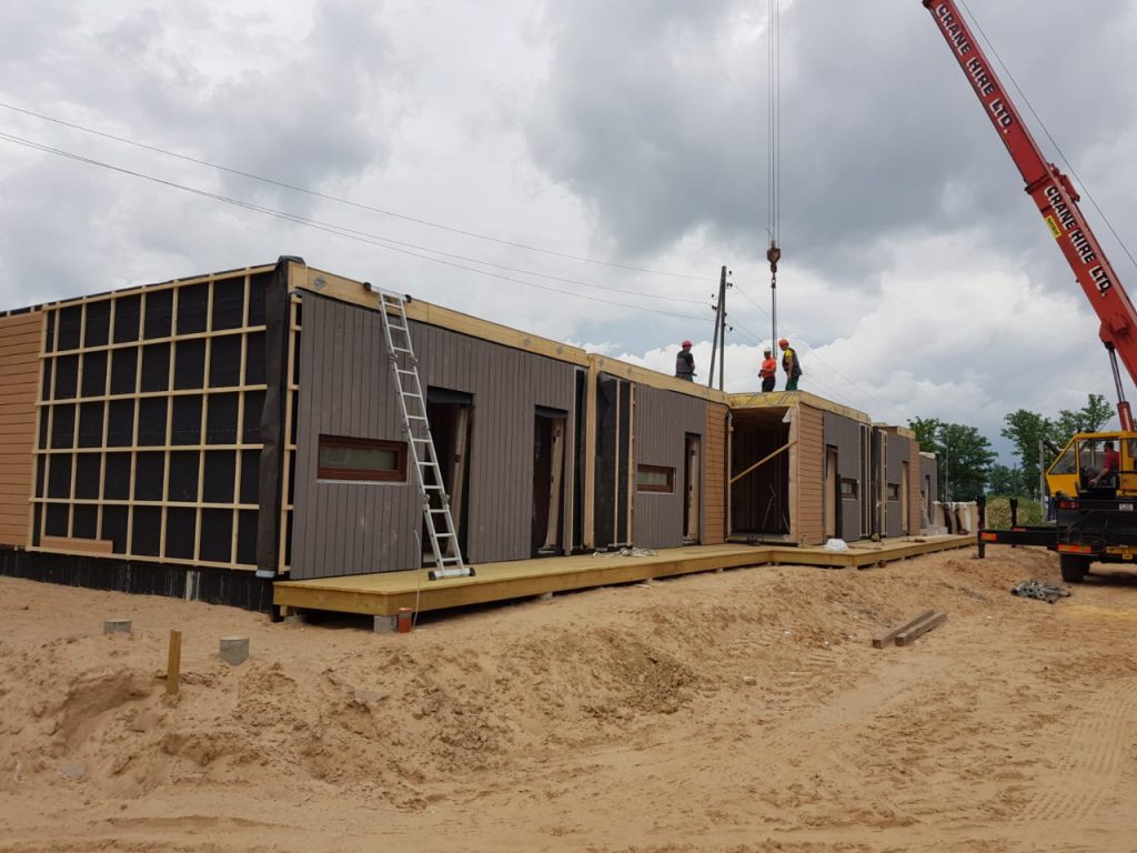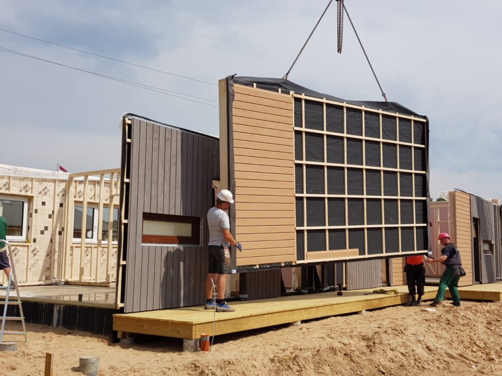 Saražotie sienu paneļi no ražotnes tika vesti jau ar ārējo apdari, bet logi tika montēti uz vietas objektā. Tikai gala sienām dēļu vertikālā apdare tikusi veidota uz vietas būvlaukumā, lai lieki nesadārdzinātu transportēšanas izdevums, vedot nestandarta izmēra paneļus, vai neradītu liekas detaļas, savienojot vertikālo koka dēļu apdari. Koka karkasa konstrukcijas montāža esot aizņēmusi aptuveni nedēļu. Katru dienu uz būvlaukumu piegādāti montāžai nepieciešamie nesošās un norobežojošās konstrukcijas paneļi un nedēļas noslēgumā bijis jau pilnībā no lietus pasargāts būvapjoms. Kopumā viss ēkas būvniecības un montāžas process bija seši mēneši.