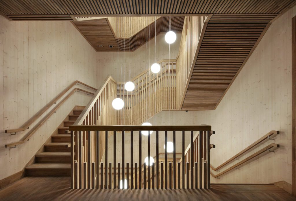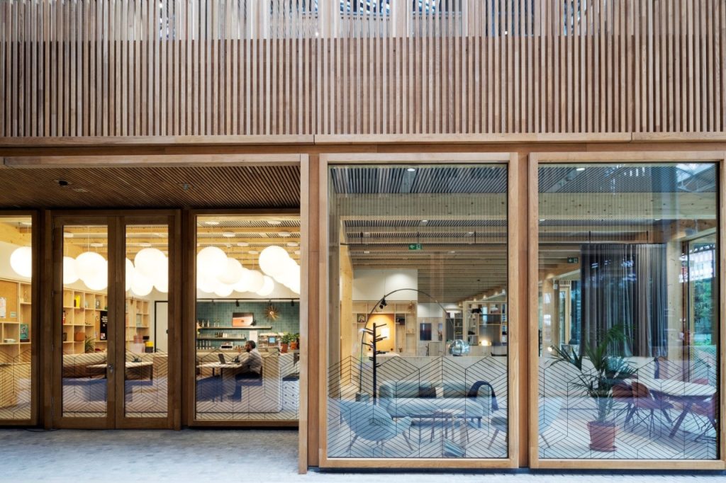 Divpadsmit biroju un mazumtirdzniecības būvju konstrukcijas izgatavotas no atbildīgi iegūtas koksnes. Izvēlētā konstrukcija no CLT un apdare no ozolkoka ir Eiropas izcelsmes materiāli, tādējādi to transportēšana un izgatavošana nerada papildu CO2 izmešus. Tāpat koksnes būvizstrādājumus var neierobežoti izjaukt un samontēt, padarot to par apritīgu celtniecības materiālu. Koka konstrukcijas paneļi interjerā atstāti redzami, tādējādi samazinot arī nepieciešamību pēc apdares materiāliem.