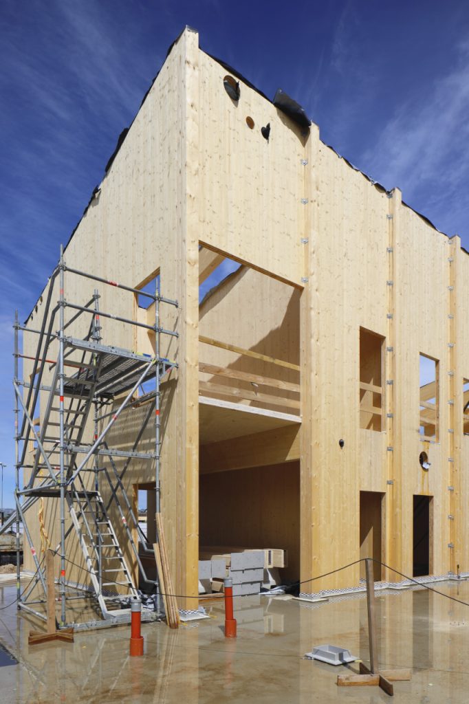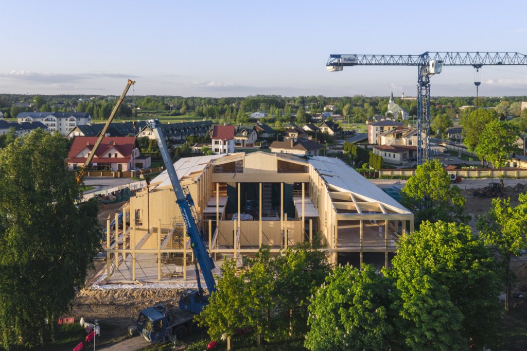 Pirms būvniecības darbu uzsākšanas, izstrādājot koka konstrukciju detalizāciju, Nordberg Construction piedāvāja atsevišķus pārseguma elementus apvienot, tādējādi ietaupot montāžas laiku. Būvkonstrukciju projektētājs Gatis Vilks bija iedziļinājies koka būvizstrādājumu specifikā, jo bija guvis pieredzi apjomīgākā koka konstrukciju projektā Piņķos, tāpēc projekta risinājumi bija profesionāli un pārdomāti. Kopumā bērnudārza ēkā izmantoti 525 līmētā koka GLT (Glulam) elementi, kas ir 256 m3 koksnes, un 703 CLT (Cross laminated timber) elementi, attiecīgi 780 m3 koksnes. Pēc izmēriem un apjomos lielākais elements bija 6,67 m3 sija, kuras platums ir 24 cm, augstums – 1,6 metri un garums – 17,67 metri. Salaspils projektā koka konstrukciju montāžu sāka februārī, kad bija zema temperatūra un sniegs, tas apgrūtināja balstmezglu aizbetonēšanu ar bezrukuma javu. Attiecīgi bija nepieciešams lietot specifiskus materiālus un gan pirms, gan pēc betonēšanas pasargāt betonējumu no sasalšanas. Lai arī koka konstrukciju montāžai lielie mīnusi nerada problēmu, tomēr, plānojot darbus, jāņem vērā arī specifisku mezglu izbūve un ziemas apstākļu ietekme, jo tas var ietekmēt gan finanses, gan laika grafiku.