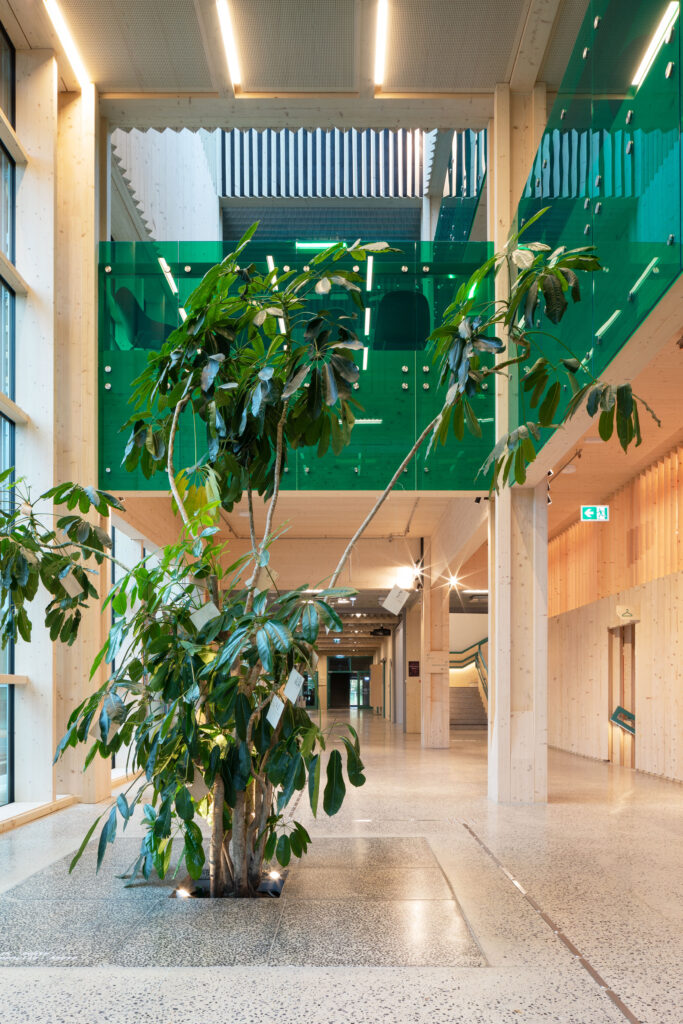 Četru stāvu ēku veido trīs savstarpēji savienoti kubveida apjomi ar apbūves platību 3773 kvadrātmetri un kopējo telpu platību 8274 kvadrātmetri. Ģimnāzijas ēkā 85% konstrukciju ir veidotas no līmētā koka kolonām un sijām, kas kombinētas ar krusteniski līmētajiem koksnes paneļiem, kopumā izmantojot 2800 kubikmetrus līmētās koksnes konstrukcijās, kas daudzviet ir arī iekšējā apdare. Papildus 3600 kubikmetri termokoksnes izmantoti ēka fasādes konstrukcijā.